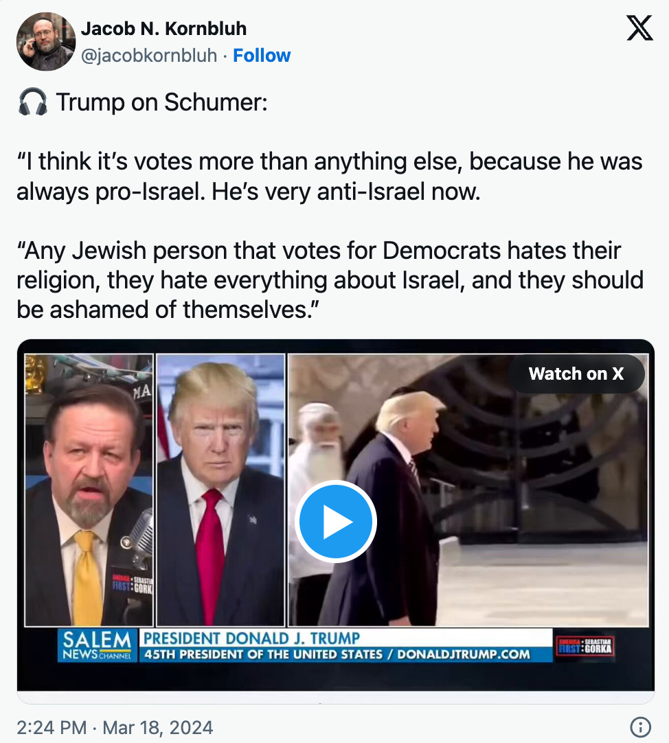 Trump’s comments come after Senate Majority Leader Chuck Schumer (D-N.Y.), the nation’s highest-ranking Jewish official, stunned Israel when he called on the country to make “significant course corrections” in Gaza” last week. Those changes, Schumer said, included a new government, a major condemnation of Israeli Prime Minister Benjamin Netanyahu as the death toll in Gaza has reportedly topped more than 30,000 people, including many women and children.