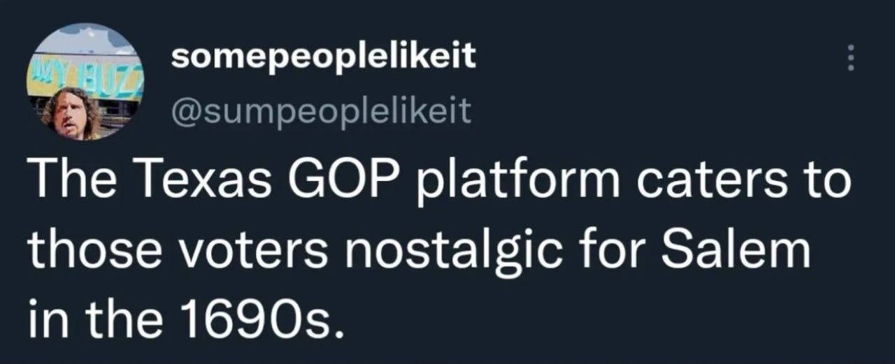 And it was all part of the biggest takeaway from the Texas GOP convention- the Texas GOP is no longer making any pretense of trying to camouflage their Far-right extremism. They’re openly embracing it, and they don’t care who knows about it. Their revised party platform rejects American democracy in favor of one-party rule- which would be a Republican theocracy, of course.