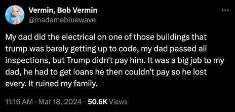 “Contrition?” I doubt that word even exists in the Trump family vocabulary. No, the patriarch, as well as the minions, excel at portraying themselves as victims, despite the fact they’ve spent their careers fucking people over on their way to amassing their fortunes.