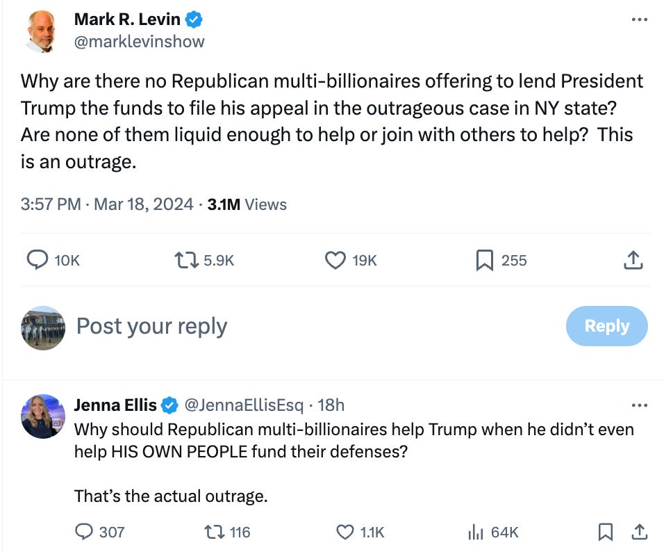 Mark Levin’s tweet is comical, expecting billionaires to rush to Trump’s rescue. What Levin fails to grasp is that one doesn’t become a billionaire by being stupid, and loaning Trump close to a half-billion dollars would verge on financial suicide. What sane, rational business person with that kind of liquidity would lend a half-billion dollars to a lying sociopath like Donald Trump?